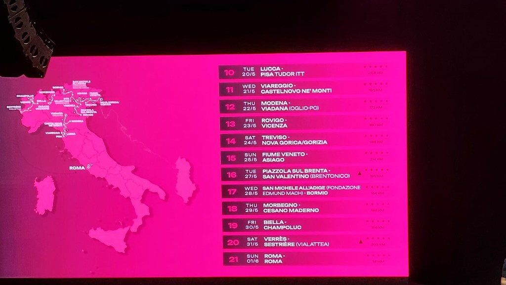 All’Auditorium Parco della Musica Ennio Morricone di Roma è stato presentato il percorso del 108° Giro d’Italia, in programma dal 9 maggio al 1 giugno, e del Giro d’Italia Women, che si svolgerà dal 6 al 13 luglio.