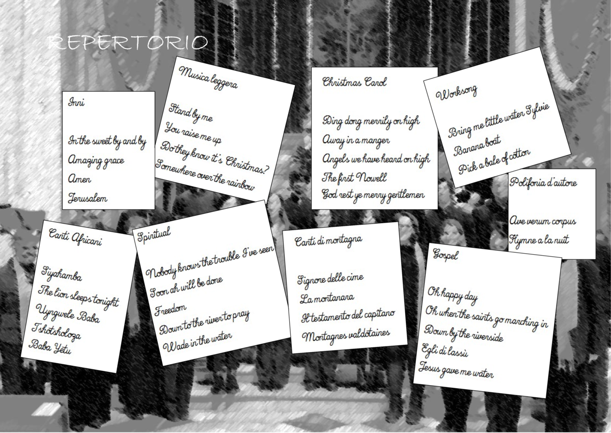 Il repertorio del coro è strutturato su uno sfondo che non cambia mai: "Sono tutti canti di base religiosi - racconta Careddu -. Tutti i nostri testi sono delle preghiere del tipo 'ora la mia vita è tremenda, ma dopo sarà meglio perché dio mi salverà'. Il nostro repertorio, in generale, è molto vasto e si inserisce nello 'spiritual' ma anche nei canti delle tradizioni africane. Devo dire che qualche volta, ma negli anni passati, abbiamo fatto qualche incursioni nei canti di montagna".
