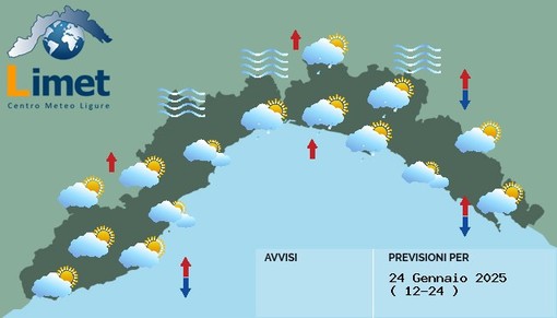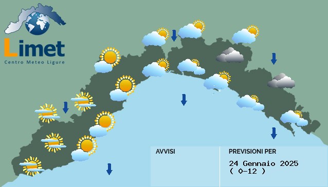 Tra la notte e la mattinata schiarite sul settore centro-occidentale della costa. Tempo più chiuso a Levante con occasionali pioviggini segnatamente sul Tigullio. Possibili banchi di nebbia nelle vallate dei versanti padani centro-occidentali. Nel pomeriggio generale aumento della nuvolosità bassa su tutta la regione fino ad avere cielo molto nuvoloso quasi ovunque tra pomeriggio e sera, con rischio di pioviggini tra Tigullio occidentale e Genovese. Qualche schiarita in più al lati della regione.
