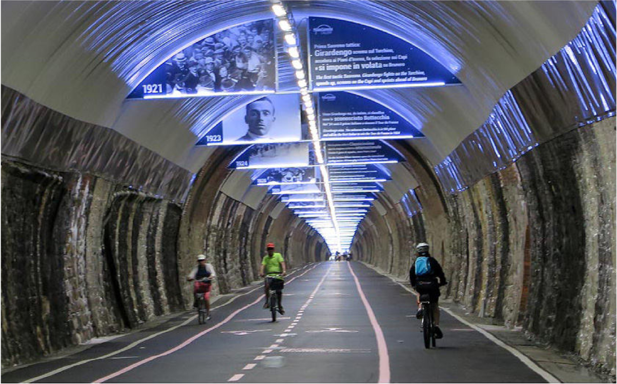 Esempi di riconversione di tratti viari di galleria (ex sedimi ferroviari) dismessi e abbandonati ad uso di nuovi percorsi ciclopedonalI: