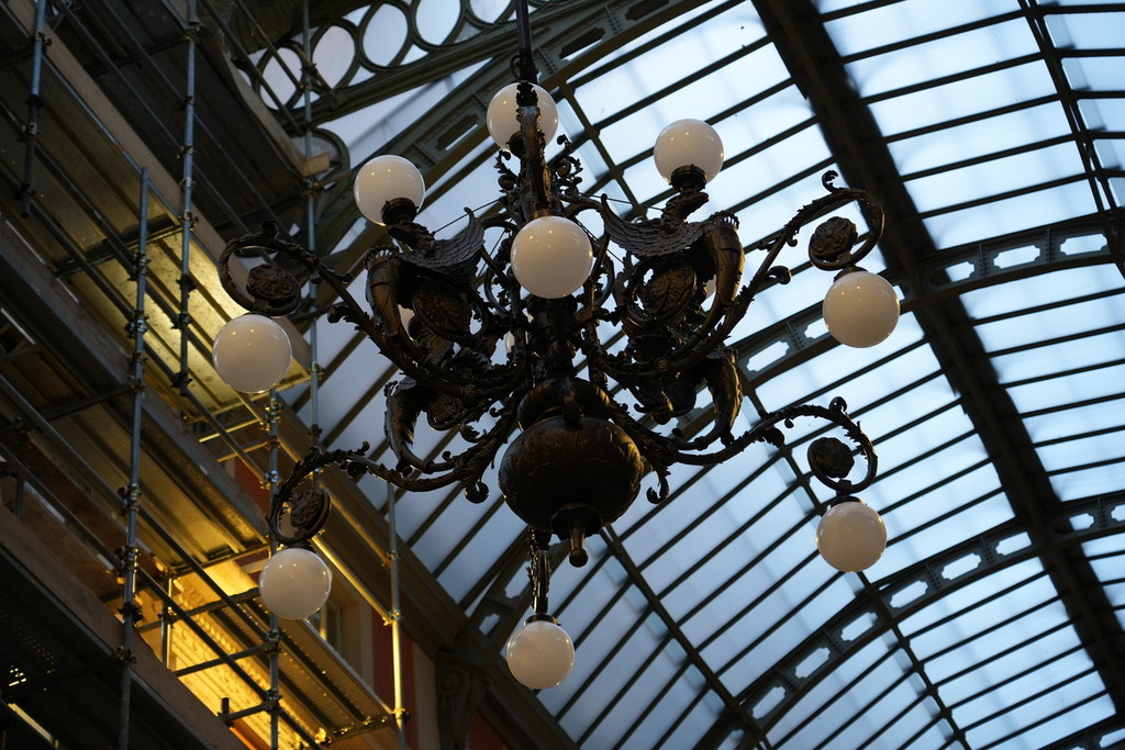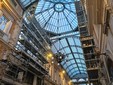 Il riposizionamento dei lampadari, che sarà terminato nei prossimi due mesi, è stato preceduto dall’intervento di ripulitura in un’apposita officina in strutture metalliche realizzate ad hoc. I lampadari sono stati dotati di un nuovo sistema di sostegno a imitazione di quello originario costituito da otto tiranti collegati a un unico elemento di raccordo. Il progetto di restauro ha l’obiettivo di riportare l’immagine della galleria al suo stato originario, completando parte dell’apparato plastico-decorativo in elementi metallici fusi, attualmente assente sulle facciate interne e sul prospetto interno ed esterno vicino a piazza Labò. A luglio è stata completata la prima fase del cantiere (da ingresso piazza Labò e galleria De Barbieri) con il recupero e il risanamento delle strutture di copertura in carpenteria metallica e sostituzione di tutte le vetrate. È stato incrementato il sistema di smaltimento delle acque meteoriche, restaurato l’intero apparato decorativo tra cui i grifoni visibili all’imposta delle piramidi di copertura. Le opere apportano le dovute modifiche legate ad aspetti di pubblica sicurezza, ovvero legate alla sostituzione di tutte le vetrate di copertura di volta e lucernai, caratterizzati da vetri con rete metallica, non più conformi alla normativa in materia di sicurezza, con nuovi vetri stratificati. Le lavorazioni riguardano la sverniciatura di tutte le orditure metalliche che compongono la struttura di volte e lucernai, il trattamento delle porzioni ammalorate e ossidate e la riverniciatura secondo le cromie originali. Particolare attenzione è stata data alle quattro aquile con stemmi presenti in ognuno dei lucernai i cui interventi sono stati più accurati e minimali per mantenerne la nobile facies, così come i quattro busti con Giano Bifronte posti a coronamento sommitale dei quattro lucernai. Anche le griglie di protezione all’estradosso di volta e lucernai sono state oggetto di smontaggio, riverniciatura e rimontaggio con modifica del sistema di fissaggio, attualmente costituito da semplice filo di ferro. È in corso la seconda e ultima fase di lavoro con la sostituzione dei vetri ed elementi metallici della parte finale della Galleria.