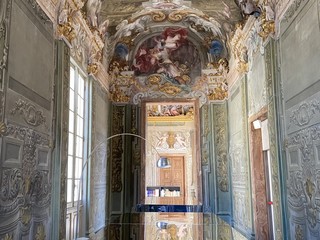 Il cuore dell’edificio è rappresentato dal grande salone, affrescato da Valerio Castello con “Il Carro del Tempo”, al centro del quale si organizzano una serie di salotti. Tra questi, spiccano quelli decorati con affreschi che raffigurano Leda e il Cigno, e allegorie come Pace, Allegrezza e Abbondanza.