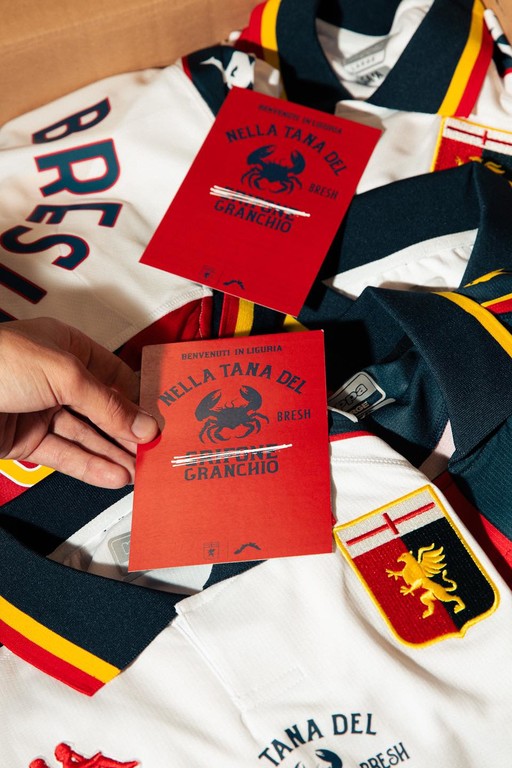 Così, dopo la partnership col Comune di Sanremo e il FantaSanremo, l'animale mitologico simbolo di Genova e della sua squadra di calcio a tinte rossoblù si è insediato ne "La Tana del Granchio". No, non è la trama di una favola di Esopo, ma la collaborazione che il cantante di "Guasto d'Amore" (eseguita lo scorso anno dalla nave Costa Crociere in una delle cinque serate di kermesse) e la società per cui tifa hanno lanciato per collaborare: da una parte in ballo c'è il successo del palco, dall'altro il lancio della nuova collezione "vintage" di maglie ispirate alla stagione '99/'00.