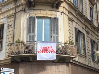 “Grazie, e che sia tutta vita” recita lo striscione appeso nel suo quartier generale, che affaccia su via Matteotti, riprendendo l’ultima strofa della sua ‘Balorda nostalgia’. E l’emozione continua.