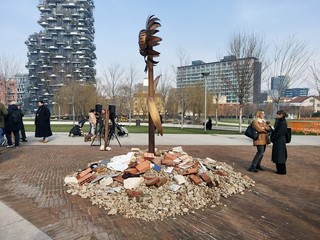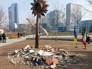 Questa mattina nei giardini della Biblioteca degli Alberi di Milano, nel cuore di City Life circondata dai grattacieli, è stata inaugurata un'installazione, un'opera d'arte, realizzata dall'artista Mauro Seresini, che sarà visitabile fino al 22 febbraio, per non dimenticare quel 24 febbraio 2022 quando iniziò l'invasione dell'Ucraina da parte della Russia.