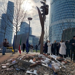 Un girasole che svetta sopra le macerie della guerra: Milano e l'Europa non dimenticano l'Ucraina: «No alla mistificazione della realtà»