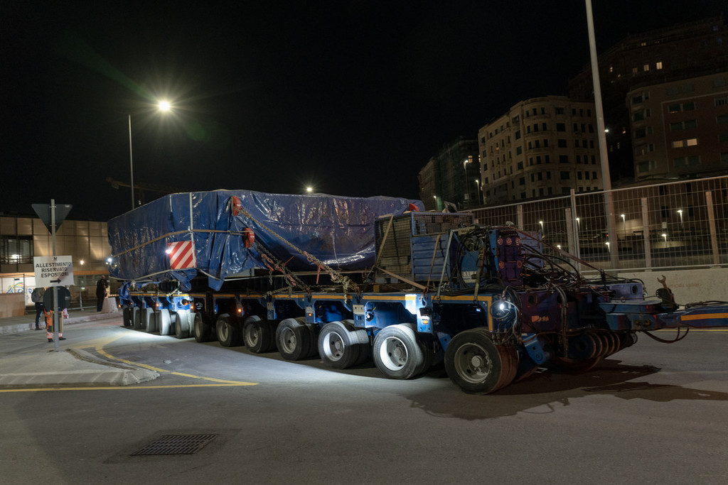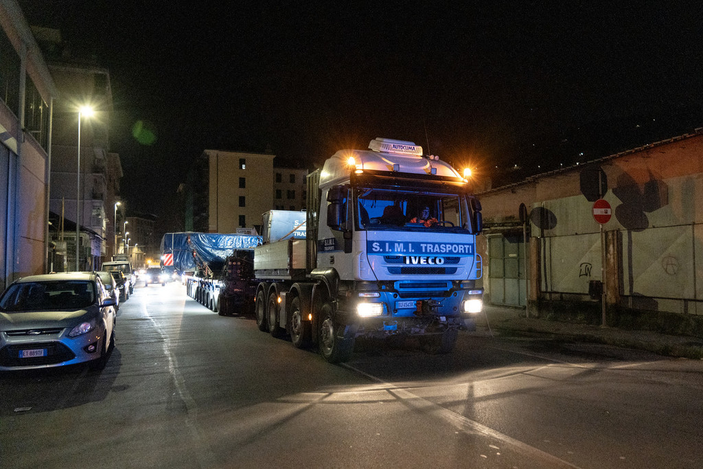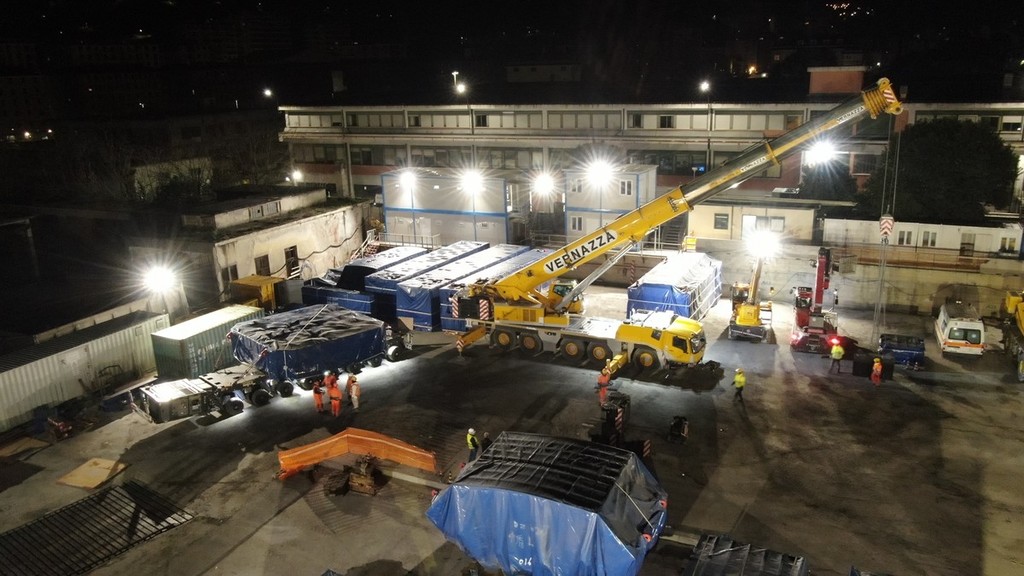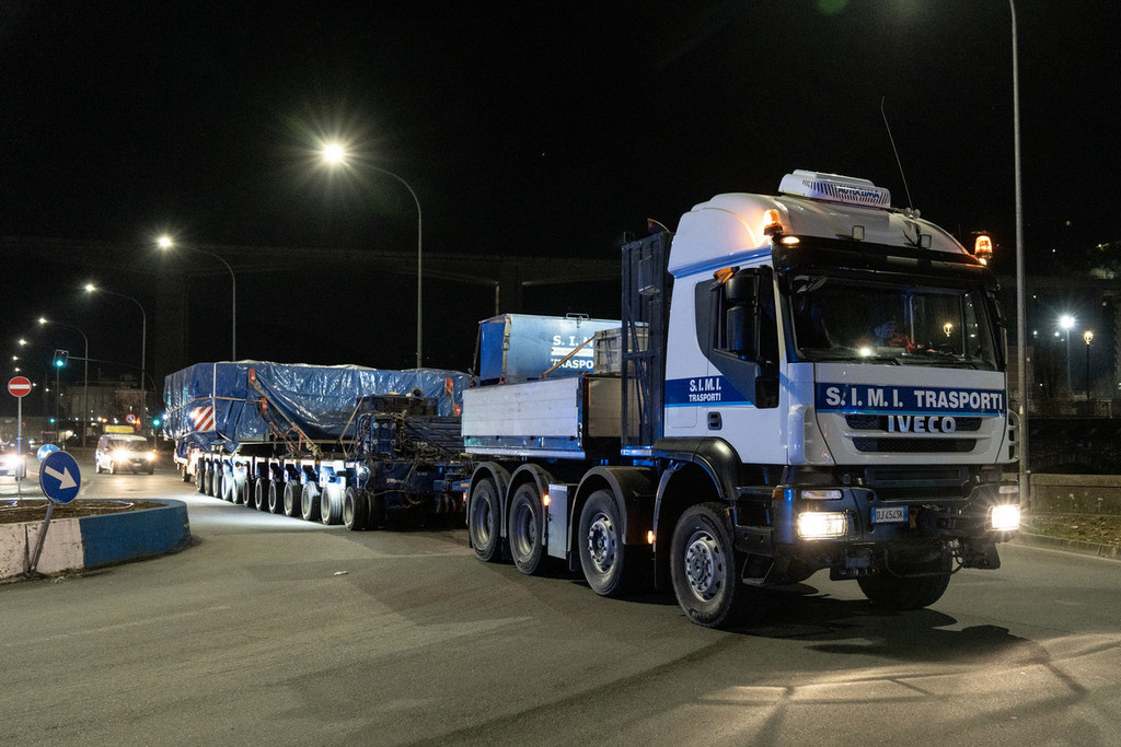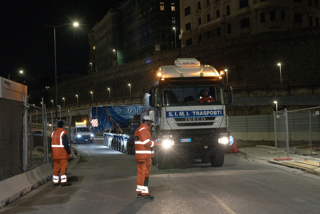 Il trasporto eccezionale, gestito da una ditta specializzata e scortato dalla Polizia locale di Genova, si è svolto senza criticità e nei tempi previsti. Le operazioni si sono articolate in due fasi: nella prima, il componente è stato trasferito su chiatta dal terminal San Giorgio ai cantieri Mariotti, dove è stato sbarcato con l’ausilio di gru e caricato su mezzi multi-asse; nella seconda, il convoglio ha attraversato via dei Pescatori fino a piazzale Kennedy. Il trasporto notturno da piazzale Kennedy all’area di cantiere si è poi svolto lungo corso Marconi, via Rimassa, corso Torino, corso Sardegna, corso De Stefanis, via Enrico Toti, via Lungo Bisagno Istria e Dalmazia, fino a via Adamoli.