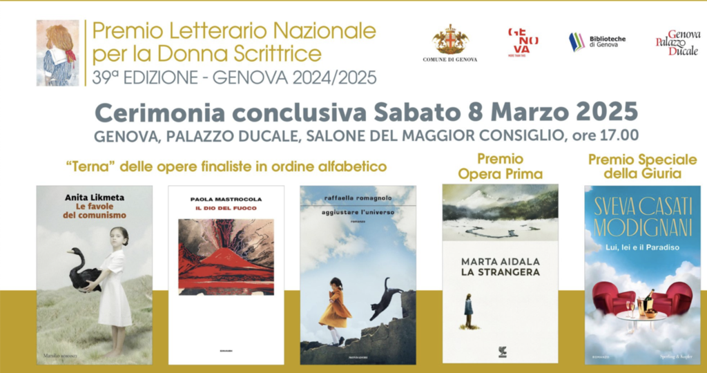 Sabato 8 marzo alle ore 17, nel Salone del Maggior Consiglio di Palazzo Ducale, si svolgerà la cerimonia conclusiva della trentanovesima edizione del Premio Letterario Nazionale per la Donna Scrittrice - Genova 2024-2025, il primo riconoscimento in Italia dedicato esclusivamente alle scrittrici. L'evento sarà condotto da Roberta Capua e vedrà la partecipazione dell'assessore alla Cultura, Lorenza Rosso.