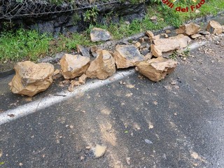 Il sopralluogo ha evidenziato che un grosso masso incombe sulla carreggiata.