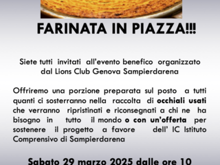 Per incentivare la raccolta, i volontari del Lions Club prepareranno sul posto la farinata, il tipico piatto ligure a base di farina di ceci. Chi donerà un paio di occhiali usati o contribuirà con un’offerta per la scuola riceverà una porzione calda e fragrante. “Resteremo in piazza fino al tardo pomeriggio, indicativamente fino alle 18 – afferma Riccardo Repetto, presidente del Lions Club – e, se necessario, correremo a comprare altra farina di ceci per non interrompere la produzione” .