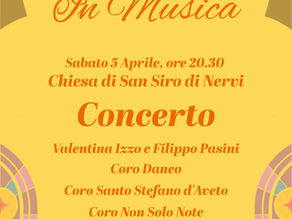 Il programma di questa settimana prevede due imperdibili appuntamenti. Questa sera, sabato 5 aprile, alle ore 20.30, la splendida Chiesa di San Siro a Nervi ospiterà una variegata esibizione che vedrà alternarsi sul palco Valentina Izzo e Filippo Pasini, il Coro Daneo, il Coro Santo Stefano d’Aveto, il Coro Non solo Note, Livia Mondini accompagnata dal Maestro Giovanni Calamaro e il Coro Il Cerchio Armonico.