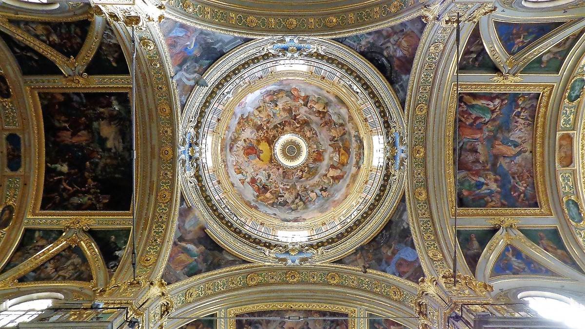 Gli affreschi di Giovanni Battista Carlone raccontano storie della vita di Cristo e della Vergine, a cui è dedicata la decorazione della cupola.