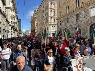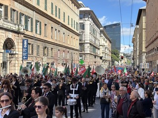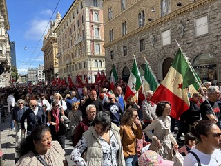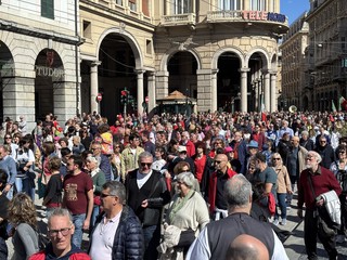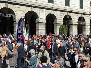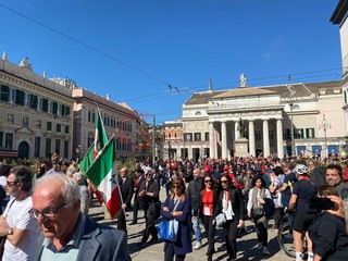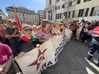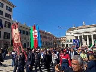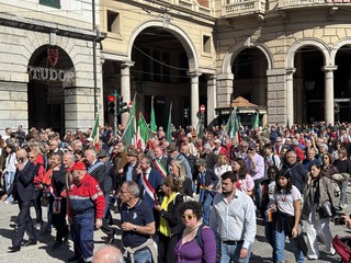 Il saluto al presidente Sergio Mattarella, il corteo da piazza della Vittoria, la corona di fiori per i partigiani caduti, e poi le bandiere, ‘Bella Ciao’ intonata a ripetizione, nonni e nipoti a camminare insieme, il ritrovo in massa in piazza Matteotti e la palese e rumorosa contestazione al vicesindaco reggente Pietro Piciocchi e al presidente della Regione Liguria, Marco Bucci.