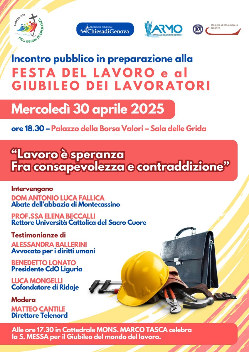 Prima del convegno, alle 17.30 in Cattedrale, Mons. Marco Tasca, Arcivescovo di Genova, celebra la S. Messa per il Giubileo dei Lavoratori, cui sono invitate le aziende, i lavoratori, i Sindacati e gli operatori economici genovesi con le famiglie.