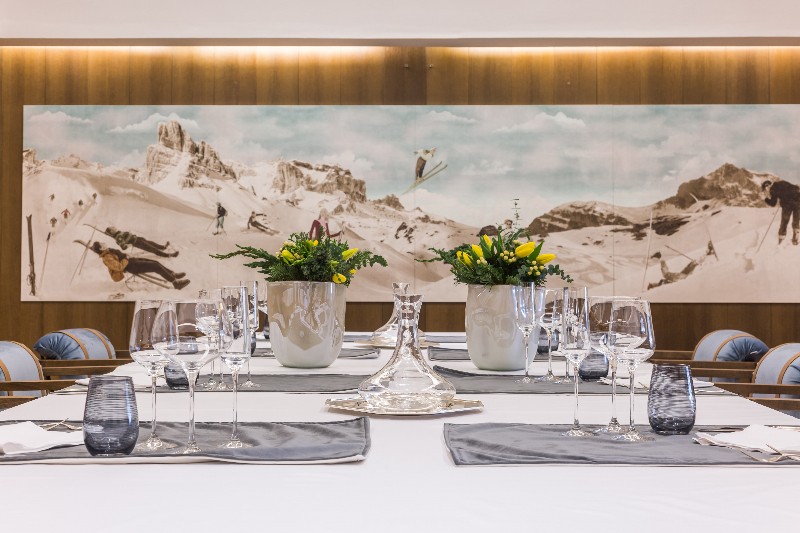 L’hotel celebra la fusione tra passato e presente anche attraverso l’arte, con opere contemporanee come quelle di Endless, artista di fama internazionale. Negli anni ha ospitato grandi nomi come Churchill, Sophia Loren e Roosevelt, diventando parte della storia mondana di Cortina.