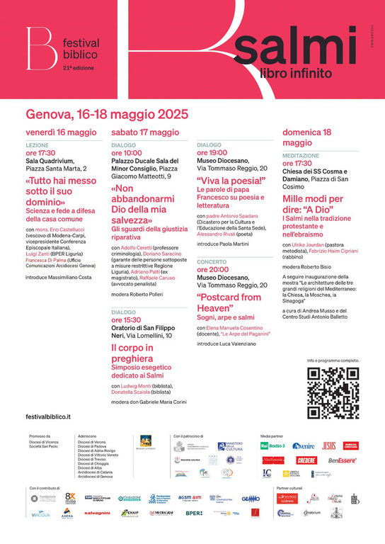 Sono diverse le Diocesi che in Italia hanno aderito alla proposta di realizzare il Festival Biblico: anche Genova lo scorso anno ha ospitato la sua “prima” edizione, dedicata al tema dell’”Agape”. Questa edizione è interamente dedicata a “Salmi. Libro infinito”. Nel Libro dei Salmi si intrecciano poesia, preghiera e narrazione: l'edizione genovese del Festival unirà anche quest’anno la profondità delle Sacre Scritture con le complessità della contemporaneità. I Salmi infatti non costituiscono solo una preghiera a Dio ma racchiudono risposte sull’uomo, sulle sue fragilità, ma anche sulla grandiosità di essere creato a immagine e somiglianza di Dio.