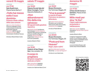 Sabato 17 maggio – ore 19 – Museo Diocesano – Dialogo - "Viva la poesia!”. Le parole di Papa Francesco su poesia e letteratura. Relatori: Padre Antonio Spadaro, Sottosegretario del Dicastero Vaticano per la Cultura e l'Educazione, Alessandro Rivali, poeta. Introduce Paola Martini, Conservatore Museo Diocesano.