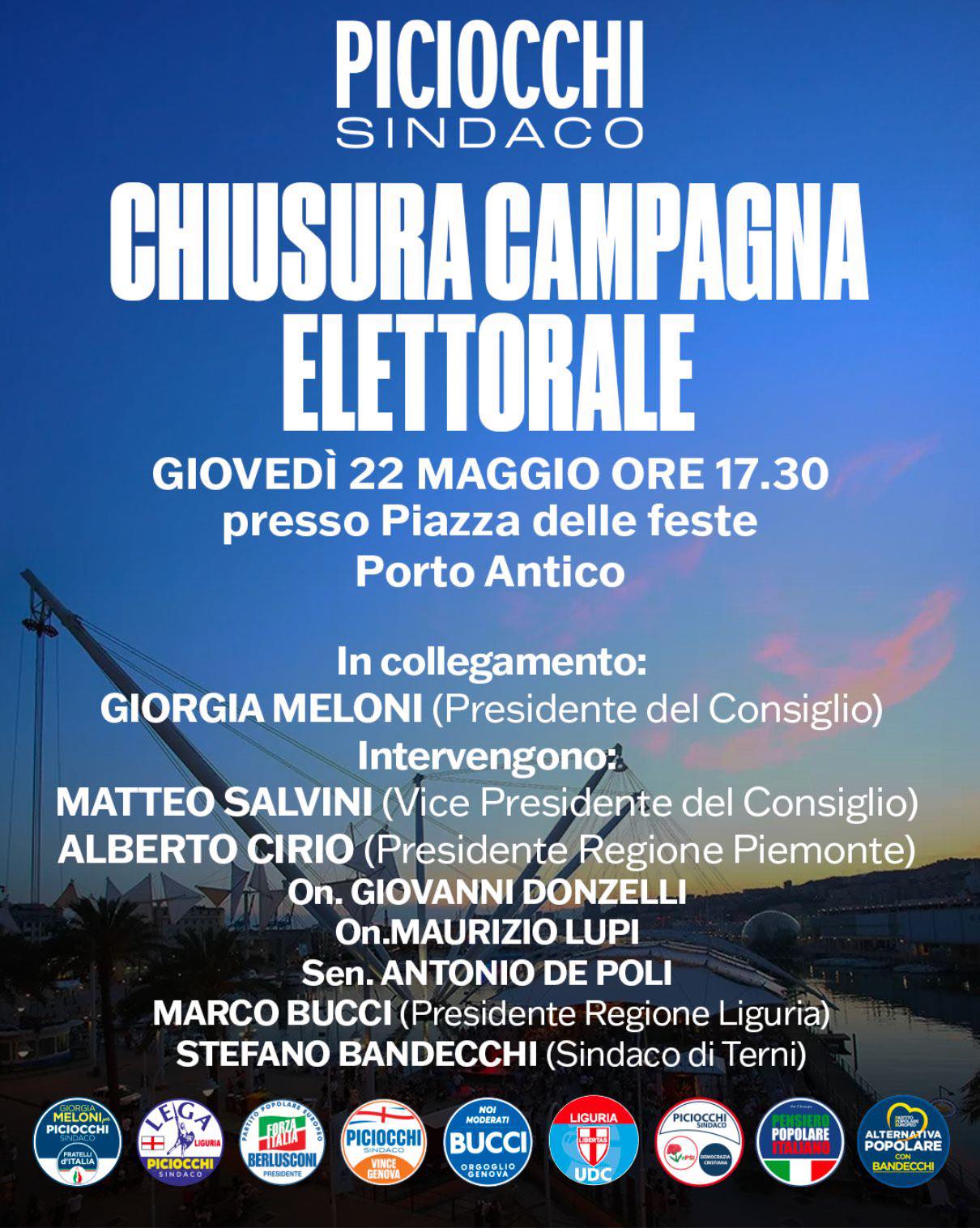 Giovedì 22 maggio, alle ore 17.30 presso la Piazza delle feste al Porto Antico: è questo il giorno che segnerà la chiusura della campagna elettorale del candidato sindaco del centrodestra Pietro Piciocchi, durante il quale sarà presente, ma in collegamento in diretta, anche la presidente del Consiglio Giorgia Meloni, che proprio oggi non ha presenziato all'evento conclusivo del Festival delle Regioni a Venezia a causa di un attacco febbrile.