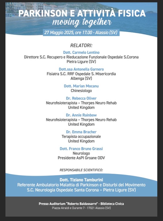 “Il nostro progetto - prosegue il dottor Tamburini - è unico nella regione Liguria, e vede coinvolti 6 comuni, tra cui Alassio, gli uffici di fisioterapia domiciliare di Albenga, Finale Ligure e Savona e l'ASD “In Movimento”, e raccoglie ad oggi più di 130 pazienti, una numerosità che rappresenta la seconda realtà italiana per tipologia di attività, in maggioranza afferenti all’Ambulatorio per i disturbi del movimento dell’Ospedale Santa Corona e provenienti anche dal presidio di Savona e in alcuni casi dal territorio imperiese. I pazienti hanno un elevato grado di soddisfazione nei confronti dell’attività fisica che viene loro proposta e lo dimostra l’aderenza al trattamento che riscontriamo. Il 27 maggio i pazienti avranno la possibilità di svolgere una seduta di attività fisica sotto la guida non solo del nostro chinesiologo Marian Mocanu, ma insieme con la partecipazione di fisioterapiste di comprovata esperienza nella neuroriabilitazione provenienti dal Regno Unito. Nel corso dell’incontro previsto per il tardo pomeriggio, i pazienti avranno inoltre l’opportunità di assistere ad un programma scientifico con interventi di alto livello a cura di esperti nazionali e internazionali che ringrazio per aver accettato il mio invito a portare il loro prezioso contributo in questa sede”.
