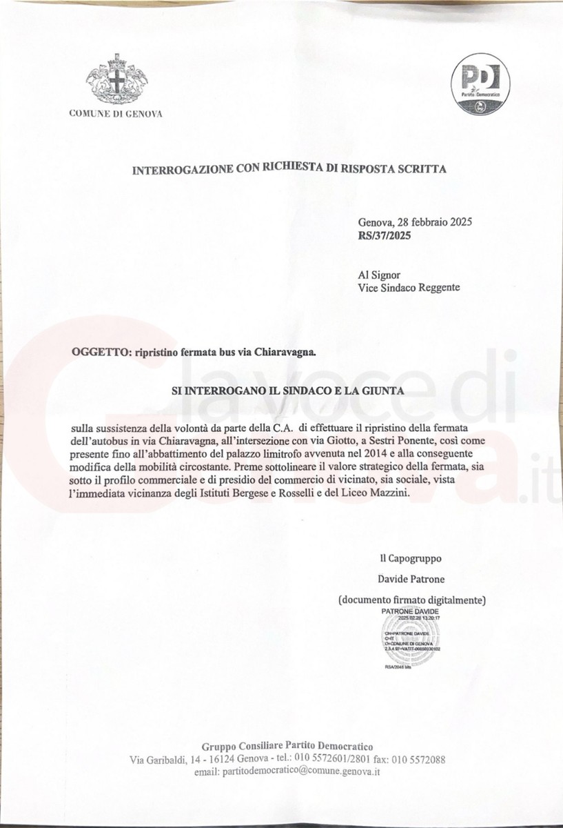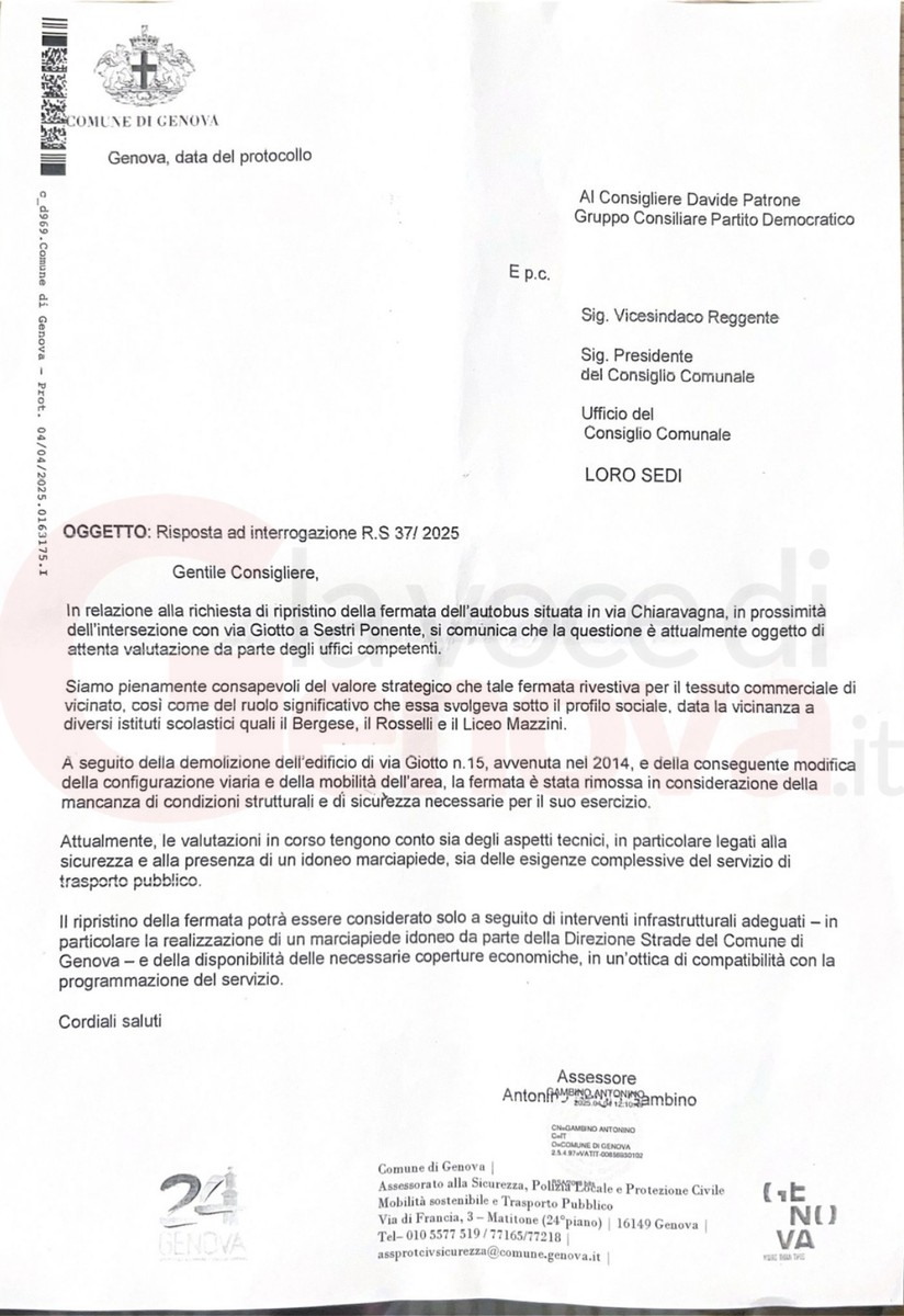 Ma la situazione è rimasta immobile.Il 28 febbraio 2025, il consigliere Pd Davide Patrone, ai tempi capogruppo del partito in consiglio comunale, ha presentato un’interrogazione comunale sul tema. La risposta dell’amministrazione non ha però risolto nulla: “La questione è oggetto di attenta valutazione. La fermata fu rimossa per mancanza di condizioni strutturali e di sicurezza. Il ripristino potrà avvenire solo dopo interventi infrastrutturali adeguati e disponibilità di coperture economiche”.