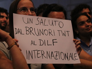 “Vi benedico nel nome del Padre, del Figlio e dello Spirito Sas” ha scherzato dal palco l’artista, ricordando il suo legame con la Liguria: dal ‘Balla coi cinghiali’, alla recentissima ‘esibizione in un piccolo teatrino che sta a qualche chilometro da qua’.