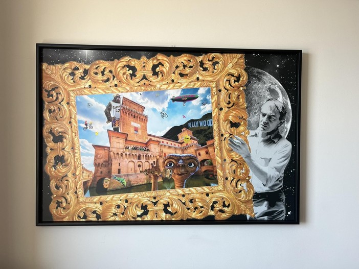 E, in effetti, l’opera di Rottigni non è un semplice ritratto o una celebrazione fine a se stessa: è un mosaico narrativo composto da elementi simbolici, stratificazioni visive e riferimenti profondi. “Ogni dettaglio è pensato. C’è un pesce che salta: è la prima creatura meccanica costruita da Rambaldi per un film. Ci sono biciclette che volano, perché da bambino guardava il padre ripararle e da lì nacque la sua passione per la meccanica. E poi c’è il castello di Ferrara, luogo a lui molto caro, la scritta Hollywood, i suoi personaggi iconici: King Kong, E.T., ma anche Pinocchio, un progetto a cui teneva moltissimo e che venne bocciato perché giudicato troppo costoso. L’ho voluto mettere in un cantuccio dell’opera, come a sottolineare la malinconia per un sogno rimasto incompiuto”.