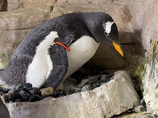 Originari delle regioni antartiche e sub-antartiche, i Papua sono la specie del loro genere che si spinge più a nord. Hanno testa e dorso neri, ventre e petto bianchi, becco rosso-arancio con punta nera e zampe arancioni. Nidificano in colonie costiere, mai troppo distanti dal mare, costruendo nidi di sassi, erbe e muschi. All’Acquario, i ciottoli per i nidi vengono forniti dallo staff, che ricrea le condizioni ideali per la riproduzione.