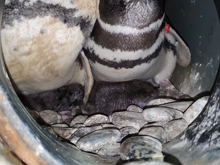 I pinguini di Magellano, originari delle coste di Cile, Argentina, Capo Horn e delle isole Falkland, raggiungeranno l’indipendenza tra le 9 e le 17 settimane di vita, un periodo che dipenderà dalla quantità e qualità del nutrimento ricevuto. Come i Papua, anche loro affronteranno una prima muta prima di potersi tuffare in acqua per la prima volta.
