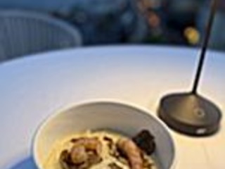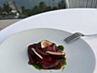 Tra le portate servite: ostrica fritta con bisque di gamberi e salsa al caramello; carpaccio di tonno con fichi freschi, cipolla in agrodolce e salsa alle foglie di fico; risotto ai gamberi di Sanremo e tartufo nero; tagliolino con gamberi, zafferano e fiori di zucchina.