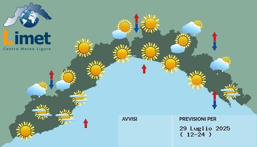 Minime stazionarie o in lieve aumento. Massime in aumento sulle coste del settore Centro-Occidentale e nelle vallate del Genovesato, complici fenomeni di 'compressione' locale.