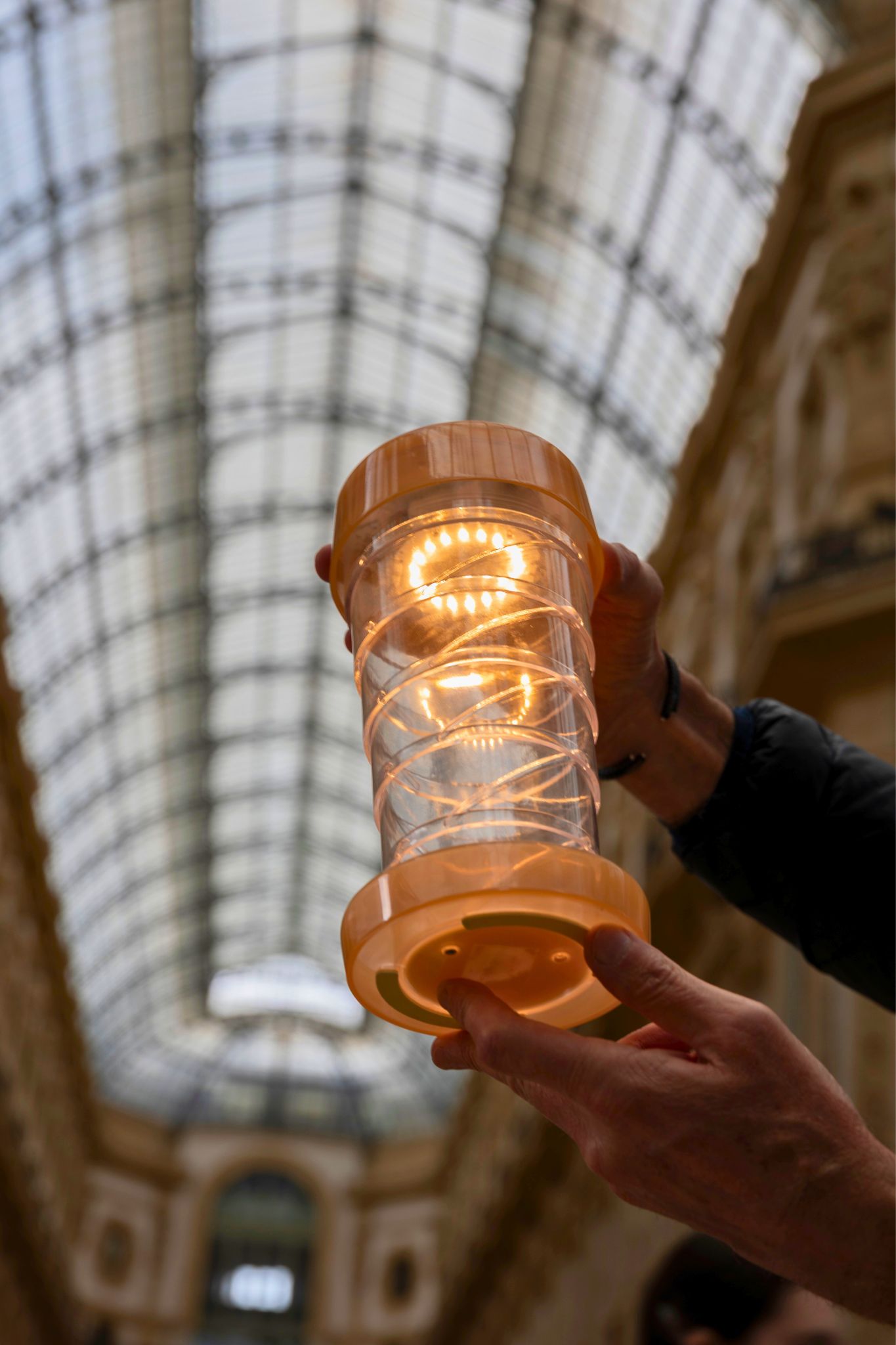 Kutyna è una sedia telescopica a scomparsa, ispirata ai bicchieri da viaggio dell’infanzia, che può trasformarsi in pouf, sgabello o tavolino attraverso un raffinato meccanismo manuale di apertura e chiusura. LaFlaminia è la sua sorella luminosa: una lampada regolabile in altezza, con lo stesso principio costruttivo, pensata per adattarsi a diversi contesti d’uso e stili di interni.