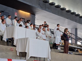 La scorsa notte ragazze e ragazzi, provenienti da Madrid, sono stati ospitati nel padiglione Jean Nouvel della Fiera del Mare grazie alla fondamentale opera di coordinamento tra Comune di Genova, Protezione Civile, Polizia Locale, Camera di Commercio, Porto Antico, Alpini e volontari della Pastorale Giovanile Diocesana. Al loro risveglio, questa mattina, i pellegrini hanno partecipato alla Santa Messa officiata dall’Arcivescovo Mons. Marco Tasca, a sottolineare il legame profondo tra la Diocesi genovese e le iniziative di fede che uniscono la Chiesa universale.