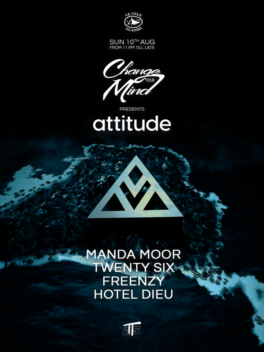 La festa continua anche domenica notte con una speciale collaborazione tra Change Your Mind e "Attitude.", rafforzando il legame tra Le Vele Alassio e il Tantra di Ibiza. In consolle: Manda Moor, talento della nuova scena House internazionale, Twenty Six, Freenzy e Hotel Dieu completano una line up dal respiro internazionale.