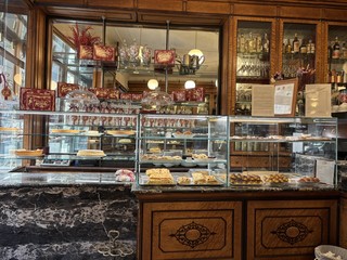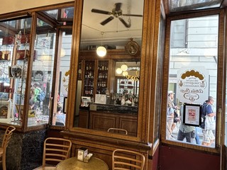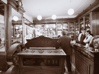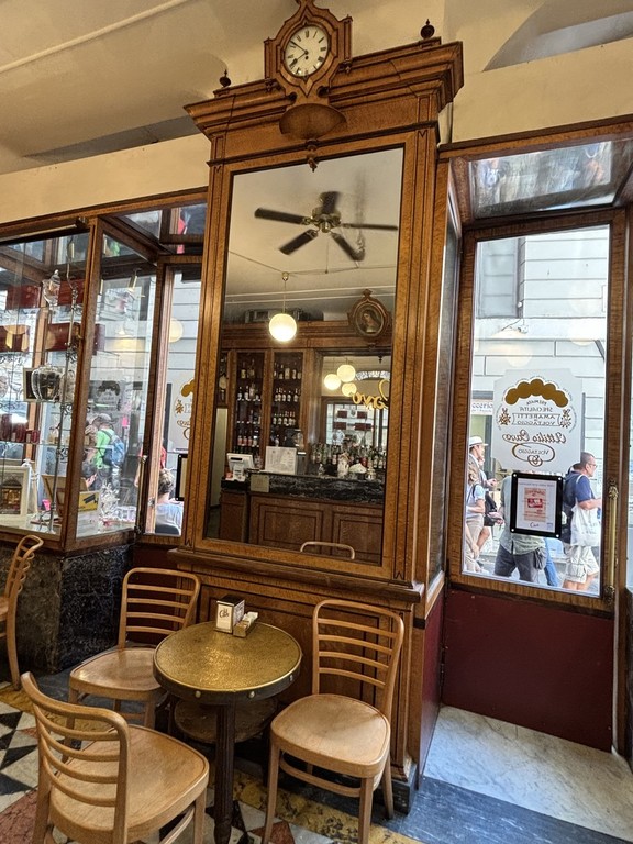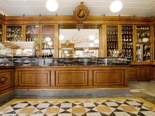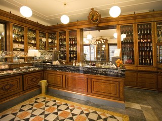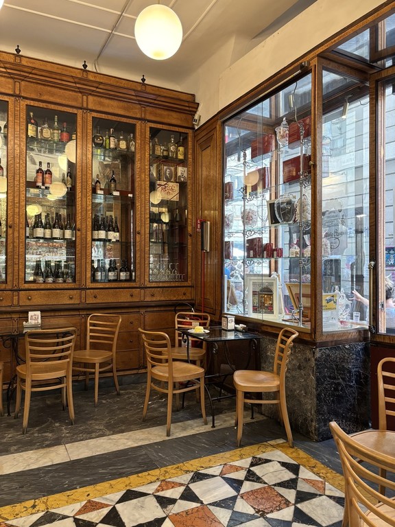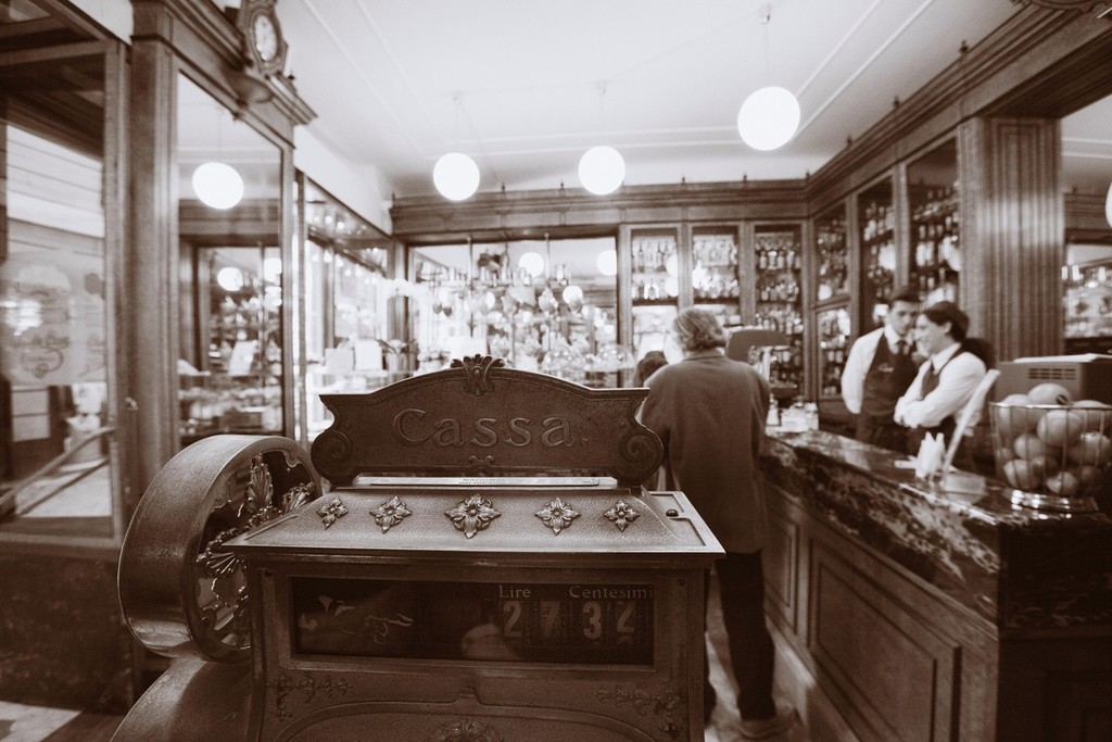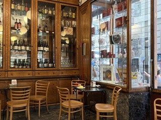 L’arredo, realizzato tra il 1870 e il 1880, colpisce subito per il suo slancio verticale, pensato in modo originale per valorizzare l’esposizione delle bottiglie di liquori. Un vero trionfo di artigianato d’epoca: legno di pioppo impreziosito da piuma d’acero, cornici in palissandro, inserti di marmo bardiglio grigio e portoro, e ferramenta in ottone lucido che dona un tocco di eleganza senza tempo. Lo stile è riconducibile al raffinato gusto Carlo X (1824-1830). Il recente restauro ha restituito splendore a ogni dettaglio, grazie a un’accurata pulizia e a una finitura a cera trasparente che ne esalta la matericità. Tra i recuperi più affascinanti, spicca il registratore di cassa originale della prestigiosa National Cash Register, fabbricato in Ohio nei primi anni del Novecento, un gioiello di design industriale.
