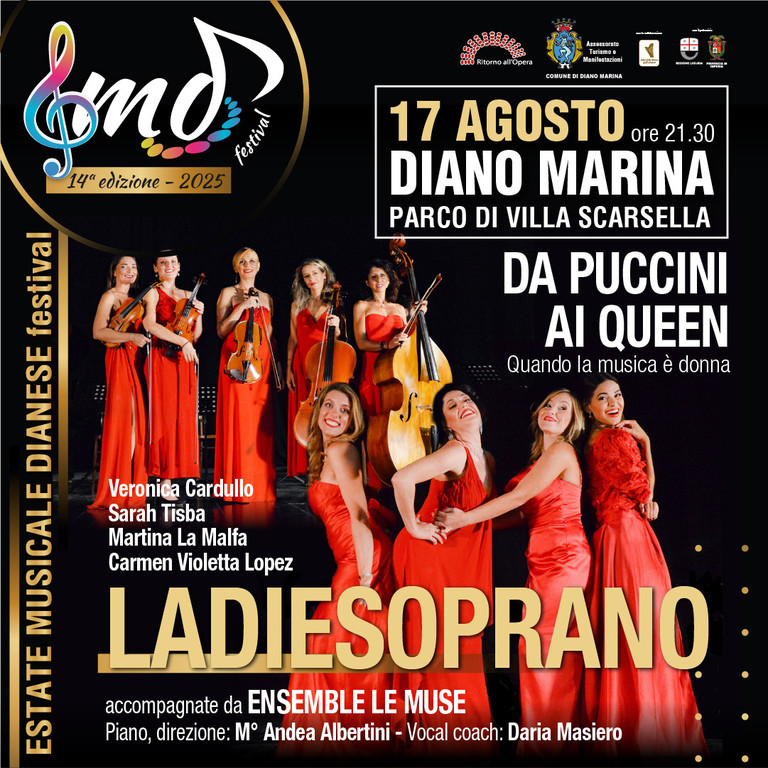 Sul palcoscenico del 14° Emd Festival di Diano Marina in arrivo un nuovo appuntamento in... rosa. Dopo la splendida serata dedicata Mina e Ornella Vanoni, portate in scena da Angelica Depaoli, domani, domenica 17 agosto (ore 21.30), a Villa Scarsella sarà il momento dello spettacolo (unica data in Liguria per il 2025) “Quando la musica è donna, da Puccini ai Queen”, un viaggio tra i capolavori del pop e della lirica, con protagoniste nove affascinanti artiste di altissimo livello: il quartetto LadieSoprano e il quintetto d’archi Le Muse. Insieme a loro, al pianoforte e alla direzione, ci sarà il M° Andrea Albertini.