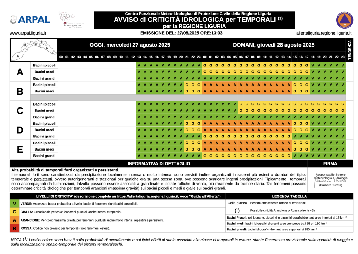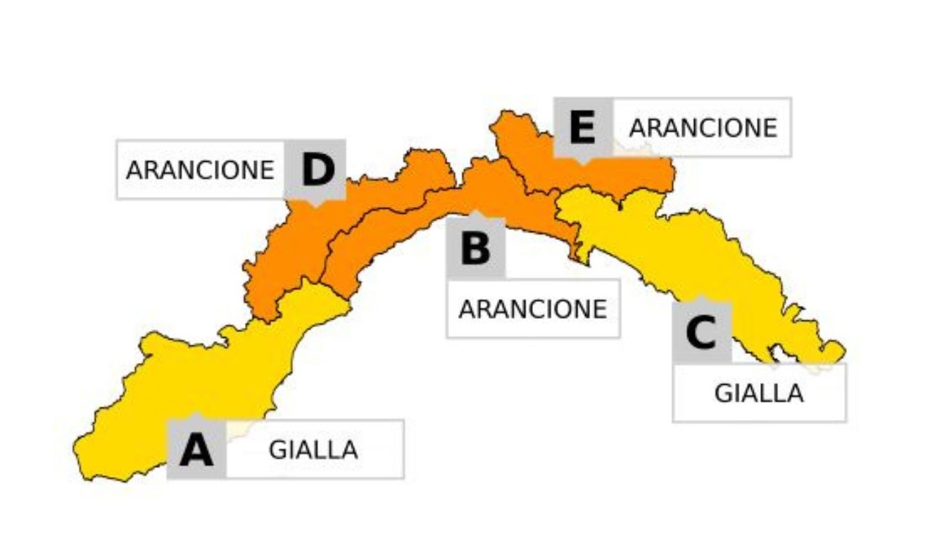 - Area A (Ponente): gialla dalla mezzanotte alle 18 di domani