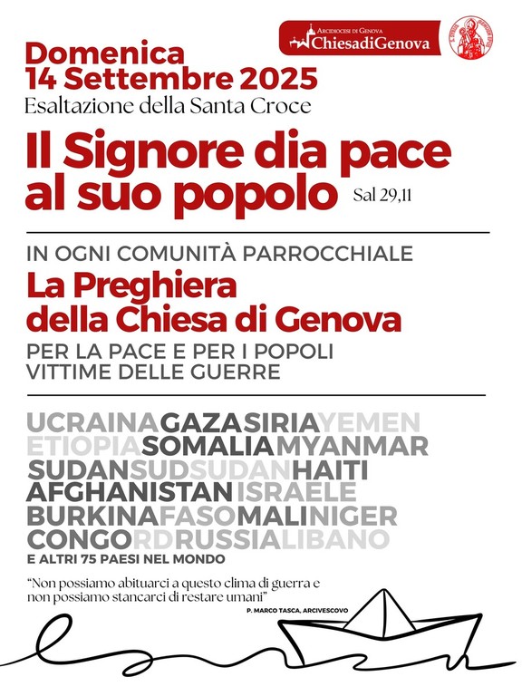 Domenica 14 settembre, nella Festa della Esaltazione della Croce, la Chiesa di Genova vivrà una giornata particolarmente dedicata alla preghiera per la pace e per i popoli vittime delle guerre.
