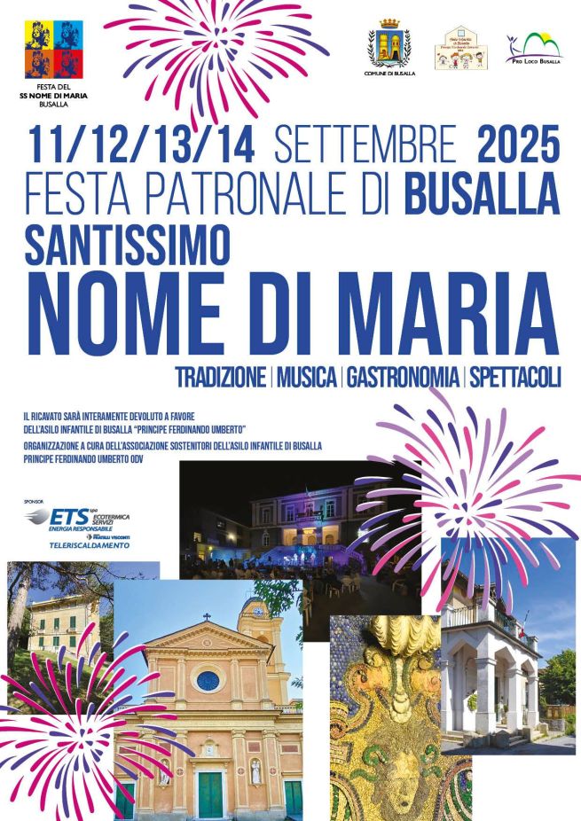 Fino a domenica 14 settembre Busalla celebra la sua festa patronale con cinque giorni di musica, spettacoli, gastronomia, mercatini e mostre. Le celebrazioni religiose culminano domenica 14 con la processione della venerata effige della Madonna (dalle 17). La festa si chiude con i fuochi d’artificio da ponte Zuccarino verso le 23.45, condizioni meteo permettendo. Il ricavato è destinato all’asilo infantile “Principe Ferdinando Umberto”.