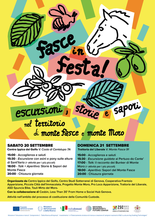 Un fine settimana speciale, sabato 20 e domenica 21 settembre, invita cittadini e visitatori a immergersi nella natura e nella storia del Monte Fasce con “Fasce in Festa”, iniziativa nell’ambito del progetto MAGIC (Monte Fasce Area for Green Initiatives and Conservation), gestito dalla Città Metropolitana di Genova e finanziato dal Piano Nazionale Ripresa e Resilienza (PNRR). L’evento offre escursioni guidate a piedi, passeggiate con pony e asini, racconti di storie e attività locali, degustazioni di prodotti tipici e momenti di approfondimento sul patrimonio naturale e culturale dell’area, grazie al coinvolgimento di enti e associazioni impegnati nella cura del territorio, spesso con volontariato.