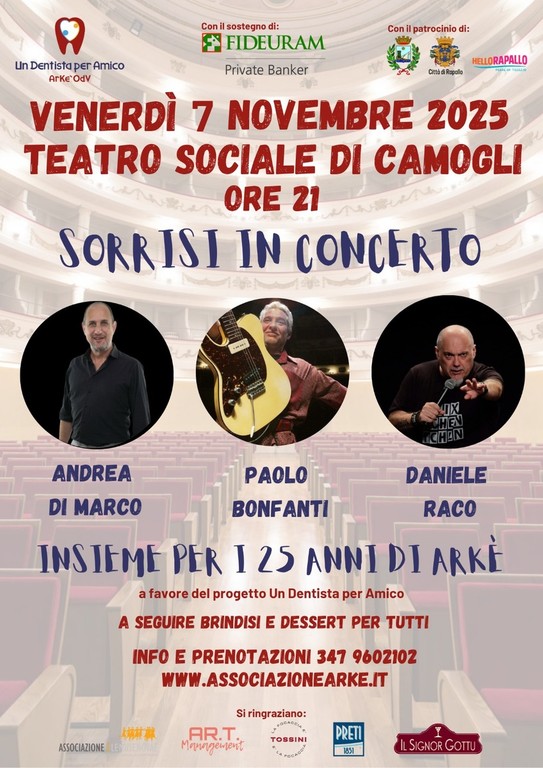 Per celebrare i 25 anni di attività, Arké invita tutti a partecipare alla grande festa in programma venerdì 7 novembre 2025 al Teatro Sociale di Camogli. La serata sarà un’occasione speciale per ripercorrere la storia dell’associazione e guardare al futuro con entusiasmo. Sul palco si alterneranno il blues coinvolgente di Paolo Bonfanti e la comicità travolgente di Andrea Di Marco e Daniele Raco, in uno spettacolo che unisce musica, risate e solidarietà.