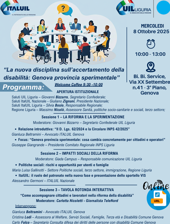 L’obiettivo dell’incontro è quello di offrire una lettura condivisa e approfondita delle nuove procedure di accertamento sanitario e concessorio, valutandone le implicazioni sociali e organizzative per cittadini, famiglie e lavoratori. Come sottolineano Giovanni Bizzarro, segretario confederale regionale Uil Liguria, e Silvia Bosio, coordinatrice regionale del Patronato Ital Uil, l’iniziativa rappresenta un’occasione per ribadire il ruolo centrale delle organizzazioni sindacali e dei patronati nel supportare il territorio in questa fase di transizione normativa.
