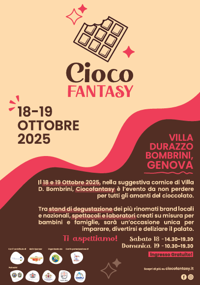 Sabato 18 e domenica 19 ottobre 2025 la storica Villa Durazzo Bombrini (Via Lodovico Antonio Muratori 5, Genova Cornigliano) ospiterà Ciocofantasy 2025, l’appuntamento autunnale dedicato al cioccolato e alla pasticceria che periodicamente richiama famiglie, artigiani e curiosi da tutta la Liguria.