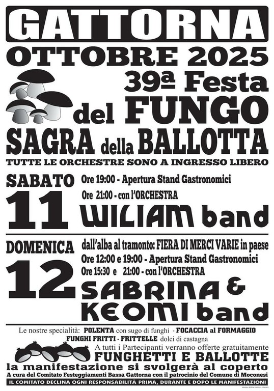 La festa è un trionfo di profumi e sapori autunnali: tra le specialità proposte spiccano la polenta con sugo di funghi, la focaccia al formaggio, i funghi fritti, le frittelle e i dolci di castagna. A rendere l’atmosfera ancora più accogliente, tutti i partecipanti riceveranno funghetti e ballotte in omaggio, un gesto che incarna lo spirito generoso della comunità locale.