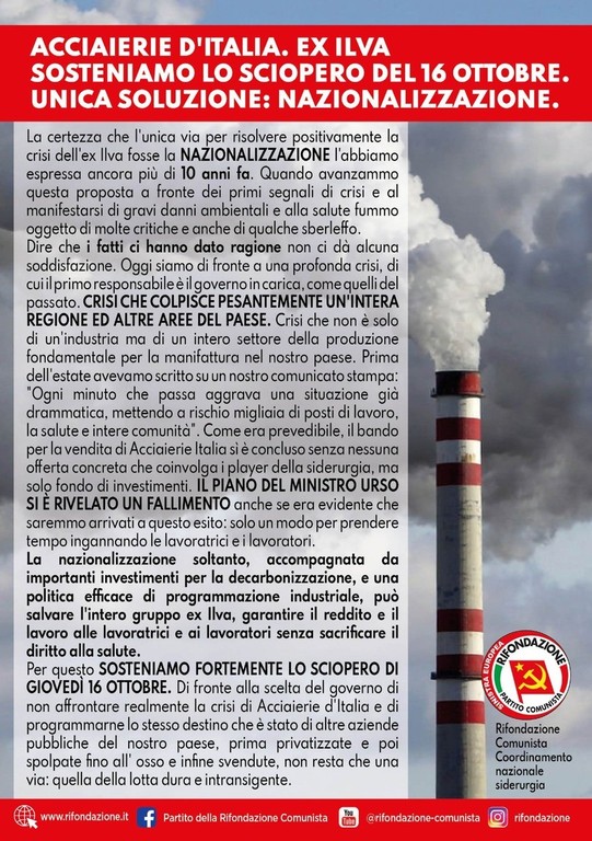 Alla vigilia dello sciopero nazionale del 16 ottobre, Rifondazione Comunista (Coordinamento nazionale siderurgia) interviene con una presa di posizione netta a sostegno della mobilitazione dei lavoratori di Acciaierie d’Italia, ex Ilva. Il partito ribadisce la necessità della nazionalizzazione come unica via d’uscita dalla crisi che da anni investe il colosso siderurgico, con pesanti ricadute occupazionali, ambientali e sanitarie.