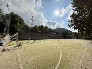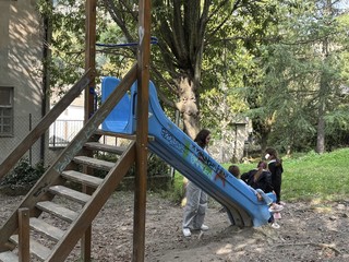 Anche gli spazi esterni giocano un ruolo fondamentale nella vita dell’associazione. Accanto alla scuola, infatti, si trovano alcune aree di proprietà della parrocchia che vengono messe a disposizione dei bambini e delle bambine in fasce orarie dedicate, per consentire loro di trascorrere del tempo all’aria aperta. Qui i piccoli possono giocare in sicurezza, immersi nella natura, tra un campo da calcio, un’area con scivolo e altalena e tanto spazio verde dove correre e stare insieme. È un luogo semplice ma prezioso, che permette di vivere il paese e la scuola come un’unica grande comunità.