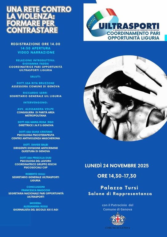 Il 24 novembre, dalle 14:30 alle17:30, a Genova nel Salone di Rappresentanza di Palazzo Tursi si terrà il convegno: “Una rete contro la violenza: fermare per contrastare” a cura del Coordinamento Pari Opportunità Uiltrasporti Liguria e patrocinato dal Comune di Genova.