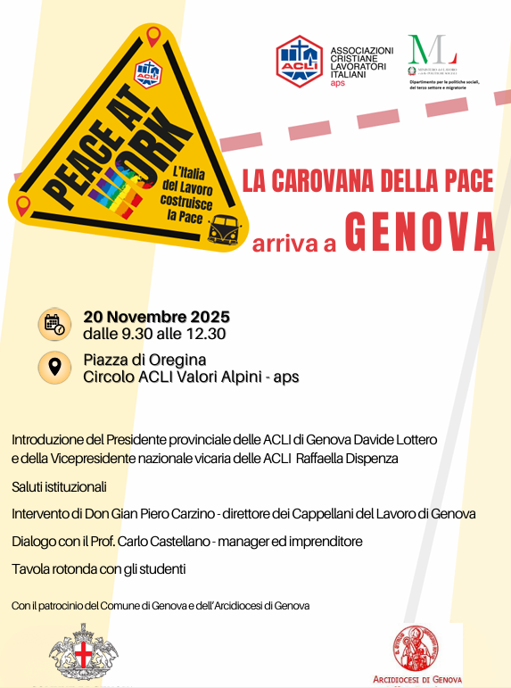 Con lo slogan “PEACE AT WORK - L’Italia del lavoro costruisce la Pace”, la Carovana della Pace sta attraversando l’Italia nei luoghi del lavoro: fabbriche, ospedali, cooperative, scuole, campi di agricoltura, cantieri edili, università, servizi sociali, carceri, teatri e musei, ma anche Circoli ACLI, Centri Servizi di Patronato e CAF ACLI, Centri Enaip. Una staffetta per rilanciare, con parole e testimonianze, l’idea che lavorare per la Pace è possibile e necessario, e che il mondo del lavoro ha voce e visione da offrire per un’Europa di pace e giustizia sociale.
