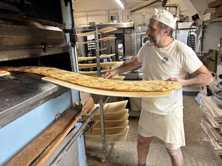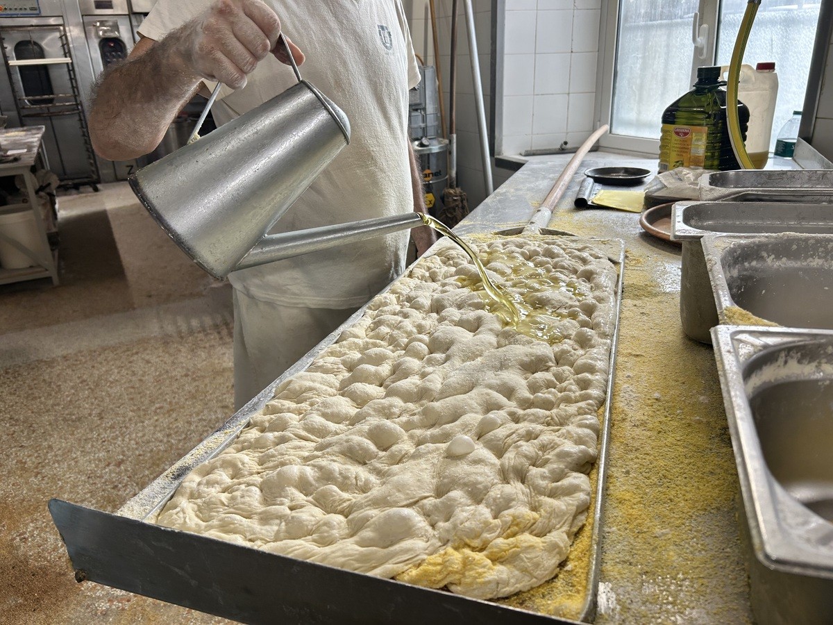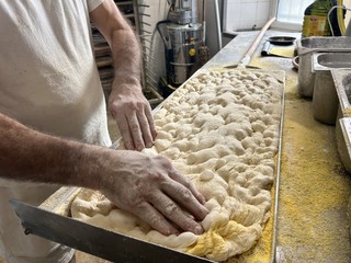 La focaccia con la polenta è un rito che non si cambia e gli ingredienti dell’impasto sono pochi: acqua, sale, farina 00, olio d’oliva e lievito di birra. Ma tutto il resto è mestiere: “A noi serve un forno lungo perché la focaccia viene messa su una pala con la polenta sotto, non essendoci la teglia”, spiega Katia. “Il forno che usiamo risale al 1935, ha quasi un secolo di vita. È davvero un pezzo di storia".