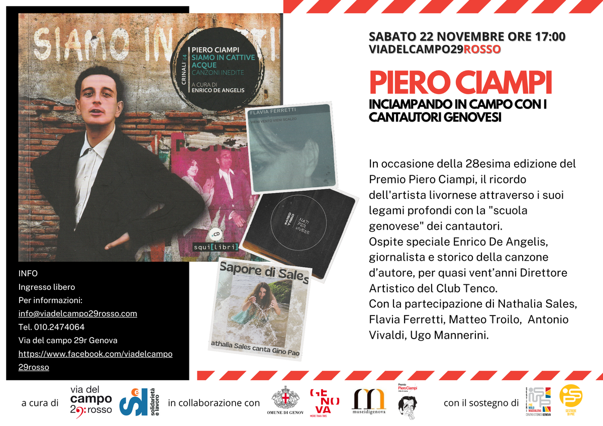 Sabato 22 novembre alle 17:00 viadelcampo29rosso, a poche settimane dalla finale della 28esima edizione del Premio Piero Ciampi, avrà luogo l’incontro “Piero Ciampi. Inciampando in campo con i cantautori genovesi, con la partecipazione di ospiti speciali.
