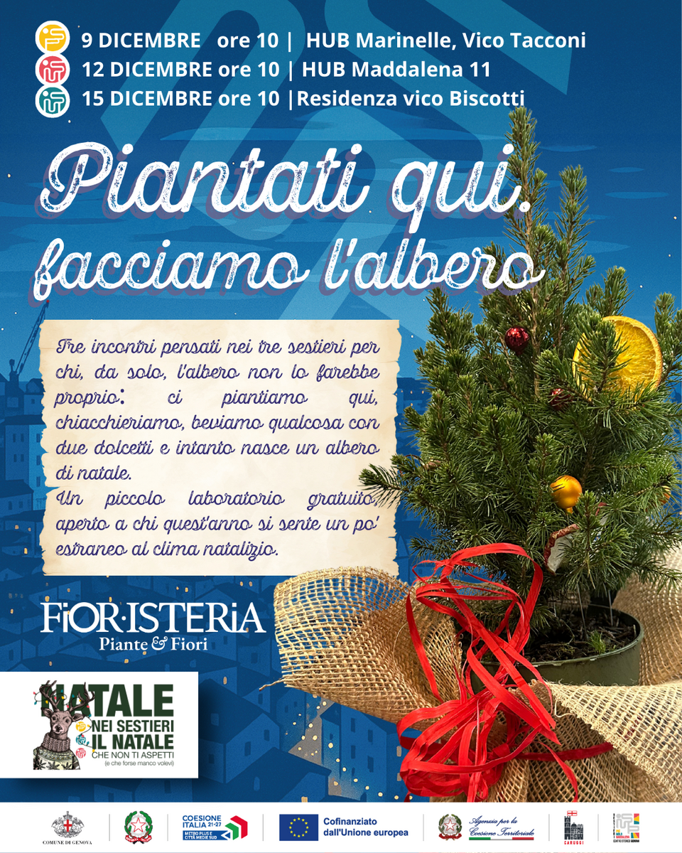 Tra le proposte simbolo del progetto ci sono i laboratori della Fioristeria “Piantati Qui – Facciamo l’albero”, ospitati negli hub dei Sestieri, che trasformano il semplice gesto di addobbare un albero in un momento di condivisione. Nel Sestiere di Prè torna anche il “Regalo Sospeso”, raccolta di doni destinati a famiglie, persone sole e a chi vive difficoltà: un gesto semplice che diventa relazione, cura e sostegno reciproco.